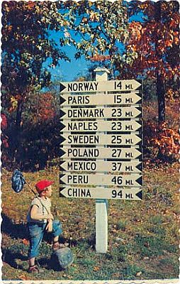 Shown here in a vintage postcard, this signpost, errected ca. 1930 at the junction of Routes 5 & 35 in Lynchville, in western Maine, shows the distances to nine Maine towns with foreign names. Although the sign has been replaced several times over the years, it looks the same today as it did then.
