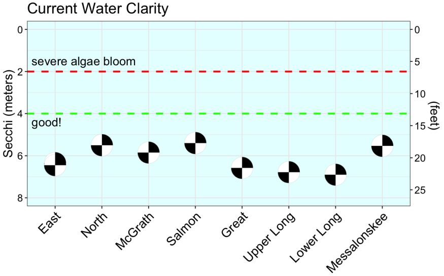 The biggest lakes in our watershed Great, Upper Long, Lower Long, and Messalonskee are all clearer now than they were in August last year, by 1 ft., 4 ft., 3 ft., and 1 ft., respectively. All three of these lakes are mostly influenced by contributions of phosphorus from the watershed, so the lack of rain recently is likely why we are seeing such great conditions on the lakes.