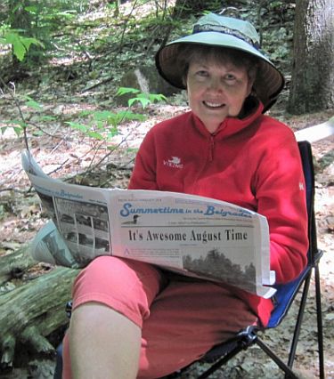 Kaet Held reading the August 3 9 issue of Summertime on the French Mountain Trail.