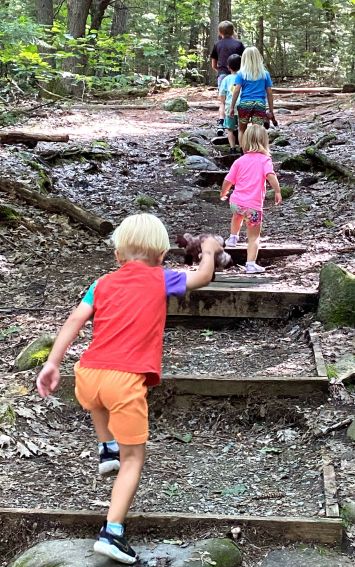 Recently, my neighbors, Joel and Kathi King, had their daughter, Modjulie Moore, and her family husband Ricky and kids Miles (11), Elliott (3), and Greta Moore (7) up from North Carolina for a week-long visit along with a grand niece and nephew Olivia Keating (3) and Luca Keating (5) from Holden, MA. Modjulie was a charter member of the Belgrade Lakes Conservation Corps, now the 7 Lakes Alliance Youth Conservation Corps, in 1996 and 1997. With the hot, humid weather this week, the family spent a lot of time on the King’s pontoon boat, fishing and swimming. They also made a trip up French Mountain with all the kids.