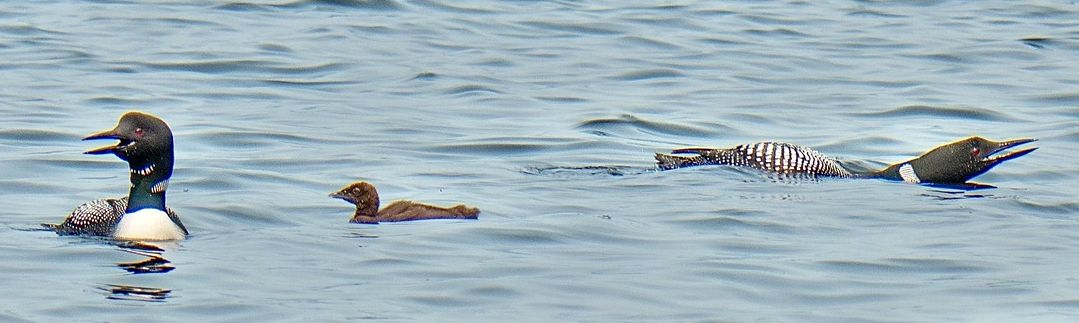 Local loon legend, Craig Killingbeck and I went down to lower Long Pond to discover that the larger of the two chicks with both parents but the smaller chick had left by itself along the shore heading North about 30 minutes before we got there. We searched the shoreline for a good 500 yds. to no avail, but did observe the adult male yodeling in that direction but further out in the lake. (Only the male loon yodels.)